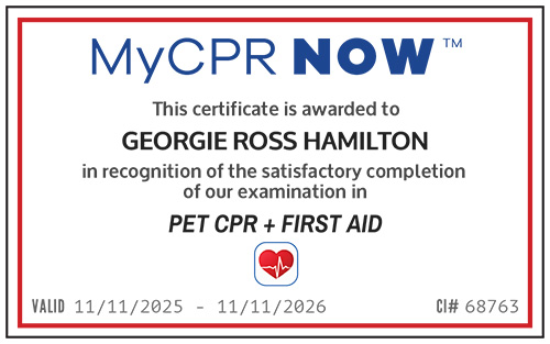 Your loved one will be safe in the hands of a certified 'Pet CPR + First Aid" carer.